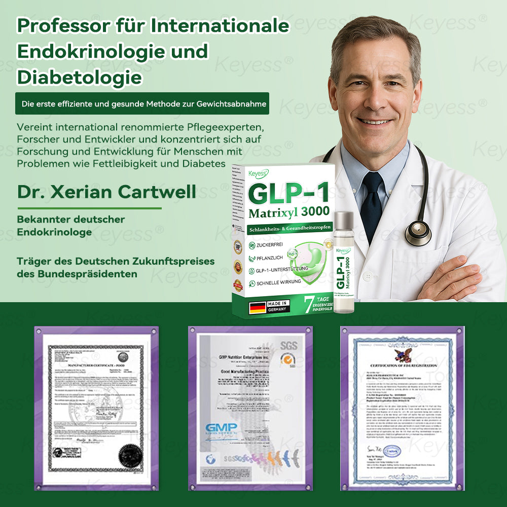"Als Endokrinologe setze ich mich dafür ein, effektive und natürliche Lösungen für den Stoffwechsel und die Gewichtskontrolle zu finden. Nach umfangreichen Forschungen und klinischen Studien mit über 5.000 Teilnehmern habe ich festgestellt, dass 𝗞𝗲𝘆𝗲𝘀𝘀® 𝗚𝗟𝗣-𝟭 & 𝗠𝗮𝘁𝗿𝗶𝘅𝘆𝗹 𝟯𝟬𝟬𝟬 𝗦𝗰𝗵𝗹𝗮𝗻𝗸𝗵𝗲𝗶𝘁𝘀- & 𝗚𝗲𝘀𝘂𝗻𝗱𝗵𝗲𝗶𝘁𝘀-𝗧𝗿𝗼𝗽𝗳𝗲𝗻 eine bemerkenswerte Wirkung auf Stoffwechsel, Appetitkontrolle und allgemeines Wohlbefinden bietet. Diese Formel unterstützt auf natürliche Weise die Aktivierung von GLP-1, hilft, den Blutzuckerspiegel zu regulieren, Heißhunger zu reduzieren und die Fettverbrennung zu fördern. Die kraftvolle Mischung aus Apfelessig, Kurkuma und weiteren natürlichen Inhaltsstoffen unterstützt nicht nur eine gesunde Gewichtsabnahme, sondern fördert auch die Verdauungsgesundheit, stärkt das Immunsystem und unterstützt das langfristige metabolische Gleichgewicht. Mit der Unterstützung moderner medizinischer Forschung ist 𝗞𝗲𝘆𝗲𝘀𝘀® 𝗚𝗟𝗣-𝟭 & 𝗠𝗮𝘁𝗿𝗶𝘅𝘆𝗹 𝟯𝟬𝟬𝟬 𝗦𝗰𝗵𝗹𝗮𝗻𝗸𝗵𝗲𝗶𝘁𝘀- & 𝗚𝗲𝘀𝘂𝗻𝗱𝗵𝗲𝗶𝘁𝘀-𝗧𝗿𝗼𝗽𝗳𝗲𝗻 eine vertrauenswürdige, wissenschaftlich fundierte Wahl für alle, die einen natürlichen und effektiven Weg zur Gewichtskontrolle und allgemeinen Gesundheit suchen."