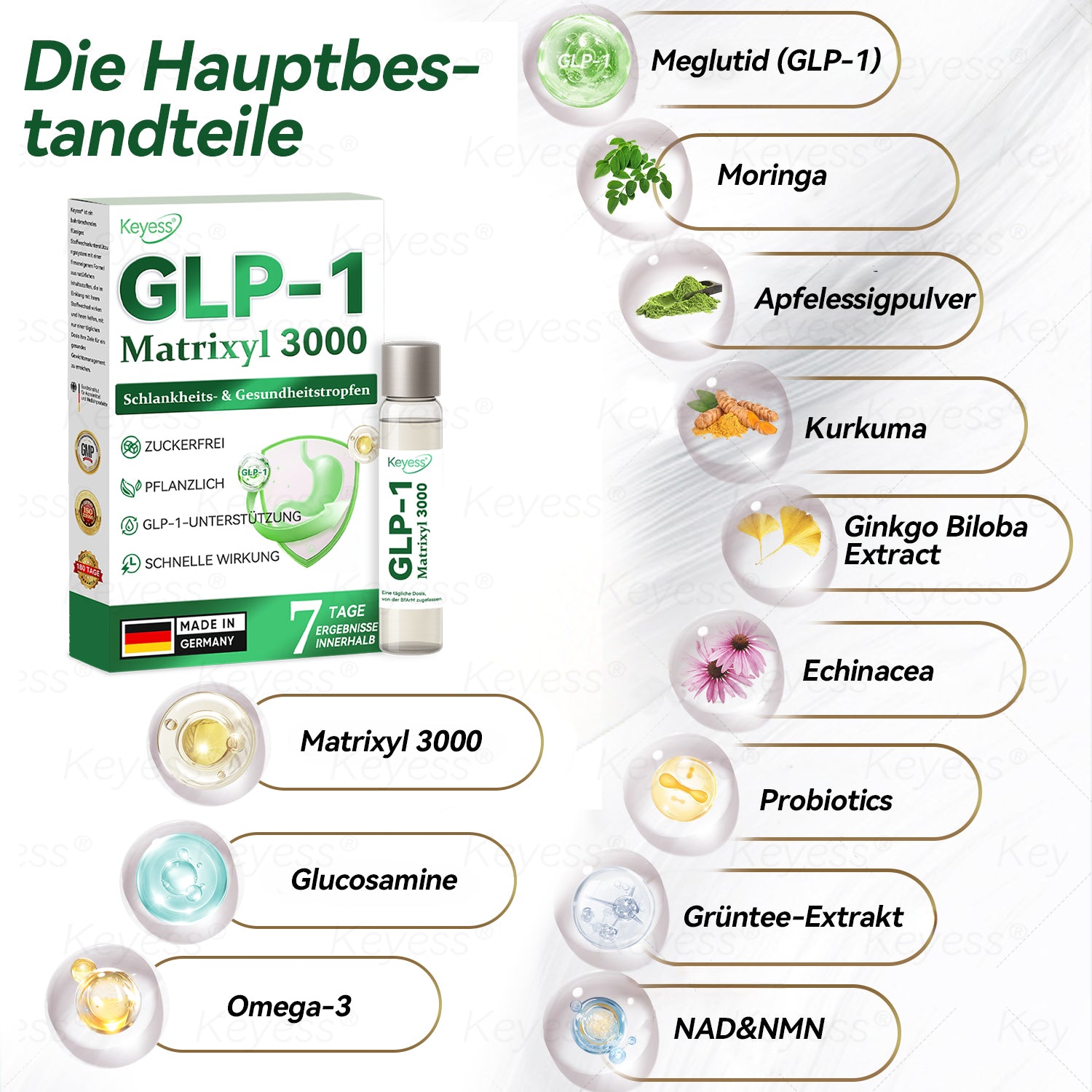 𝐊𝐞𝐲𝐞𝐬𝐬® 𝐆𝐋𝐏-𝟏 & 𝐌𝐚𝐭𝐫𝐢𝐱𝐲𝐥 𝟑𝟎𝟎𝟎 𝐒𝐜𝐡𝐥𝐚𝐧𝐤𝐡𝐞𝐢𝐭𝐬- & 𝗚𝗲𝘀𝘂𝗻𝗱𝗵𝗲𝗶𝘁𝘀-𝗧𝗿𝗼𝗽𝗳𝗲𝗻 wurden von einem Team von über 30 internationalen Experten für Endokrinologie und Diabetologie nach mehr als 3 Jahren Forschung entwickelt. Es kombiniert Tirzepatid mit kraftvollen pflanzlichen Inhaltsstoffen, um den Stoffwechsel zu steigern, die Fettverbrennung zu beschleunigen und die Verdauungs- sowie Lymphgesundheit zu unterstützen. Diese orale Lösung wurde vom BfArM für ihre Sicherheit und Wirksamkeit zugelassen und bietet eine wissenschaftlich fundierte Lösung für Gewichtsverlust und ganzheitliches Wohlbefinden.